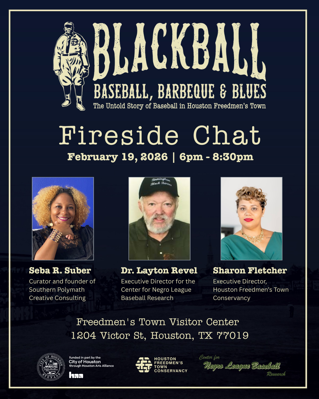 BLACKBALL | Baseball, Barbeque & Blues, is hosted by Houston Freedmen's Town Conservancy and supported by City of Houston, Houston Public Library and Houston Public Library Foundation, Houston Endowment, Institute of Museum and Library Services, Houston Arts Alliance, Southern Polymath Creative Consulting LLC, The Astros Foundation, and Center for Negro League Baseball Research.